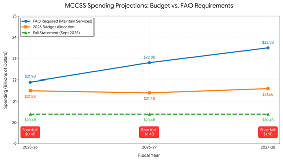 Even the revised $21.5 billion allocation falls well short of what is actually needed. The Financial Accountability Office projects a funding shortfall of $1.4 billion this year alone, growing to almost $ 1.9 billion by 2027-28, simply to maintain current service levels.