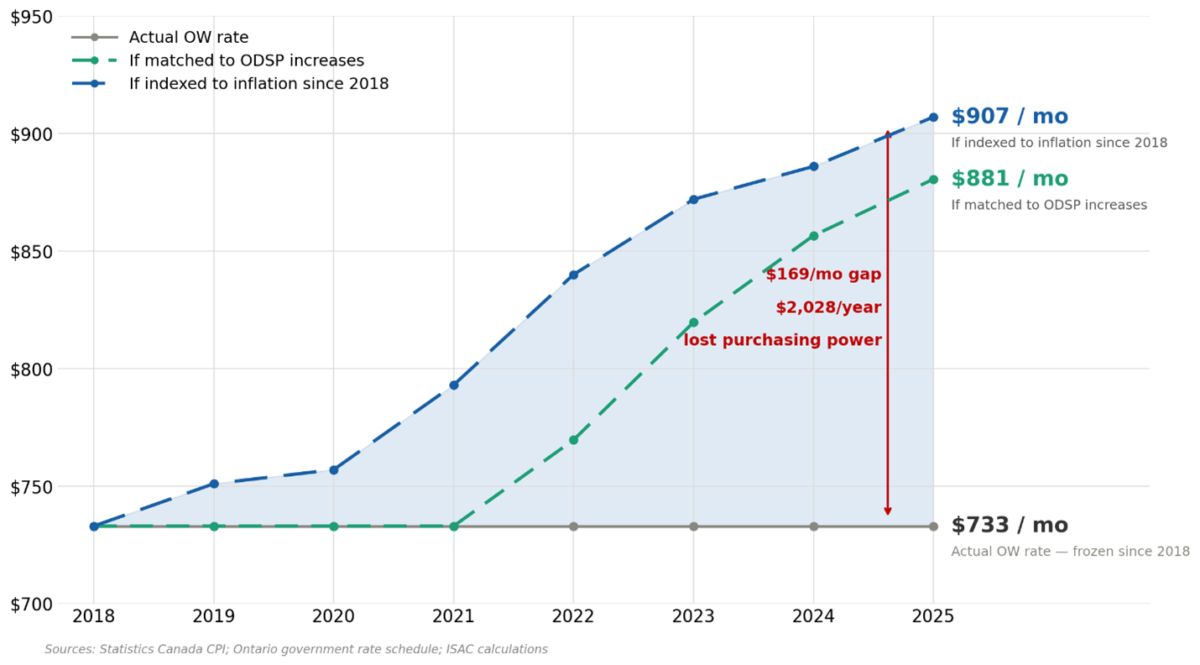 Even if OW rates had been indexed to inflation starting in 2023 at the same time that Ontario Disability Support Program (ODSP) rates were indexed to inflation, that would not have been enough to close the inflation-related OW income gap. OW recipients would still face an inflation-related income gap of $148 per month, or $1,776 per year, in lost purchasing power. The 2026 Budget does nothing to close this gap, and it is unfortunately likely to continue widening without concerted intervention.
